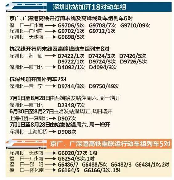 为应对暑运客流高峰,深圳北站将加开列车、开行周末线及高峰线共18对,重联运行动车组列车5对。