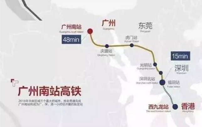 站点分别为:广州南站、庆盛站、虎门站、光明城站、深圳北站、福田站、西九龙站。全长145公里,香港段全长26公里。