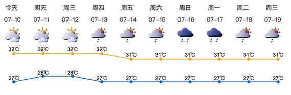 我市多云,天气炎热,局部有短时阵雨或雷阵雨;气温27-32℃;南风2-3级;相对湿度65%-95%