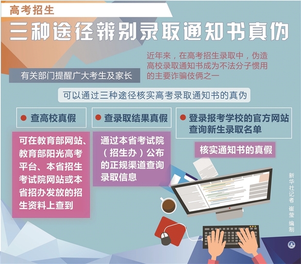 深圳新闻网讯 近年来,在高考招生录取中,伪造高校录取通知书成为不法分子惯用的主要诈骗伎俩之一。有关部门提醒广大考生及家长,可以通过查高校真假、查录取结果真假、登录报考学校的官方网站查询新生录取名单等三种途径核实高考录取通知书的真伪。