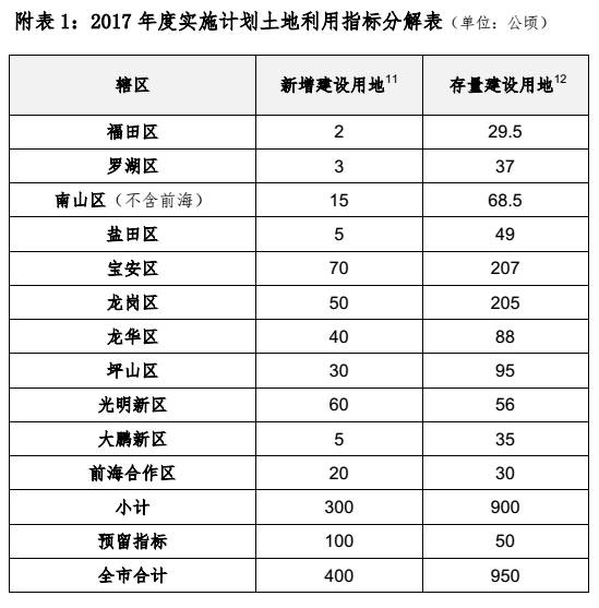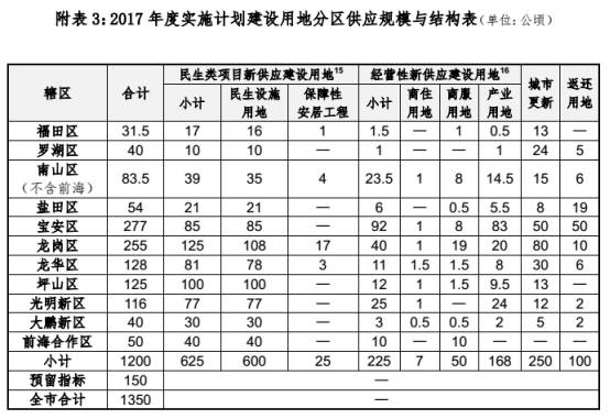 2017 年度全市(含前海合作区)计划供应建设用地 1350 万平(其中:新增建设用地400 万平,存量建设用地950 万平)。