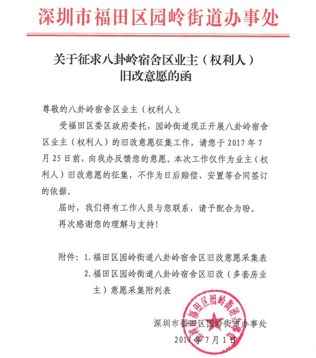 为彻底改善八卦岭宿舍区现状,福田区政府拟对八卦岭宿舍区业主(权利人)启动旧改意愿征集工作,希望业主在有效期内前往旧改办公室咨询相关事宜,并反馈改造意愿。