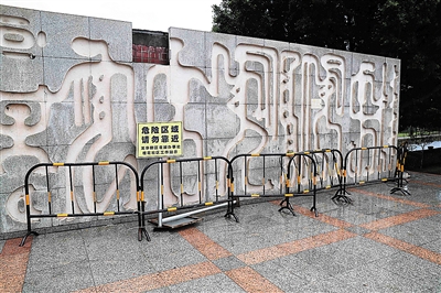 桂花社区滨河公园背景墙缺失,周边已经拉上围挡。