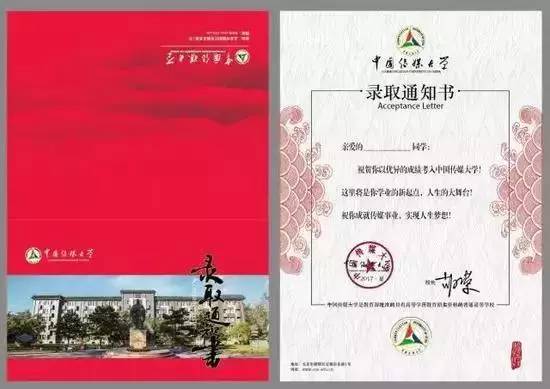 中国传媒大学2017年录取通知书正面是立德楼,楼前伫立着至圣孔子的雕像。封底是山岳的形象——日星隐曜,山岳潜形。内页以凝聚向上的线条为底纹,像生命的力量朝着梦想的方向成长,以云海纹为装饰,庄重典雅。