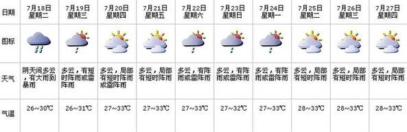 我市阴天间多云,有大雨,局部暴雨;气温26-29℃;东南风3-4级;相对湿度75%-95% 。预计早晨6-9时,全市阴天间多云,有阵雨;气温26-28℃;相对湿度75%-100%;轻微的东南风;全市能见度普遍在10公里以上,雨时能见度稍差;今天白天仍有间歇性阵雨,外出请注意带伞。