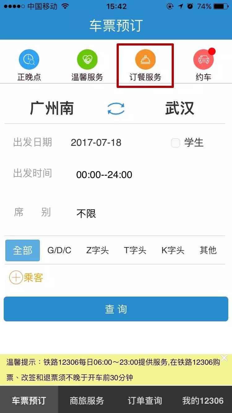 1.打开12306APP,可以看到“订餐服务”已经上线;