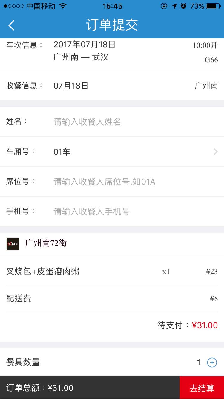 旅客在下单时,还可以选择是否需要发票,下单后还需在收餐人信息中添加本人的姓名、所乘坐的车厢和座位号以及联系方式,订餐成功后,铁路车站服务人员会把餐食送到订餐旅客指定的车厢和席位。