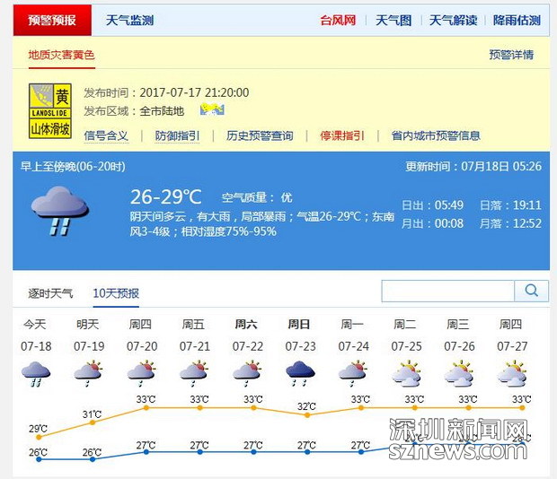 深圳新闻网7月18日讯 深圳的7月爱变脸,高温过后暴雨天又接踵而至。预计今日白天持续间歇降雨,部分时间雨势较大,雨量可达大雨到暴雨量级,而随着台风影响逐渐减弱,深圳19日起再转高温炎热天气。市气象局提醒,近期降雨频繁,累计雨量大,地质灾害等次生衍生灾害风险高,市民户外活动做好防雨准备,并远离危险边坡。