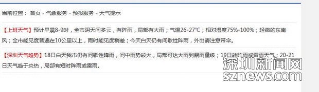 【深圳天气趋势】18日白天我市仍有间歇性降雨,间中雨势较大,局部可达大雨到暴雨量级;19日转阵雨或雷雨天气;20-21日天气趋于炎热,局部有短时阵雨或雷雨。