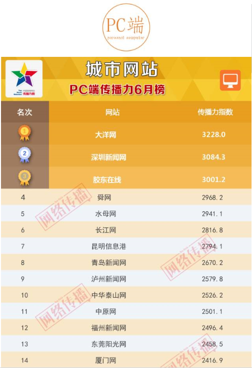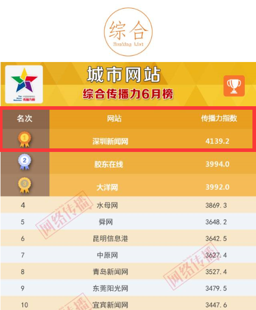 城市网站传播力6月榜出炉 深圳新闻网综合传播力排第一
