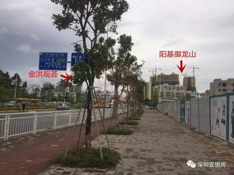项目东侧的观兴东路,双向八车道,南向至福花路段,已铺设完毕,道路两旁的护栏已建设完善、绿化植物也已修种到位。