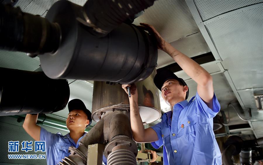 7月19日,天津至广州的T253次列车空调发电车乘务员对发电机组空气滤清器进行检查维护。新华社发(杨宝森 摄)