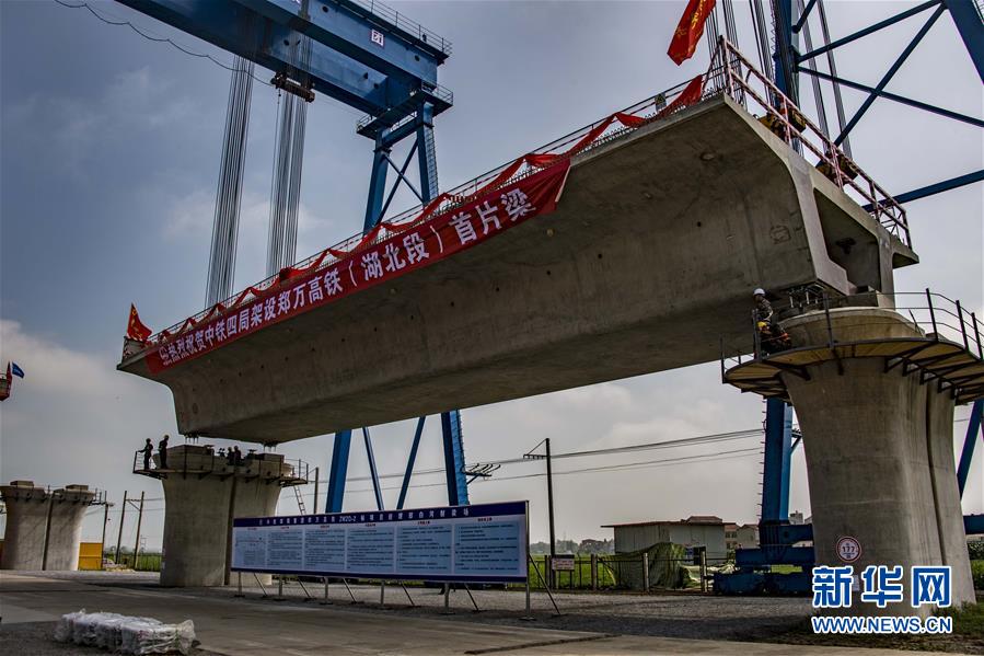 7月10日,中铁四局工作人员在湖北省襄阳市襄州区境内的郑万铁路白河特大桥架梁。