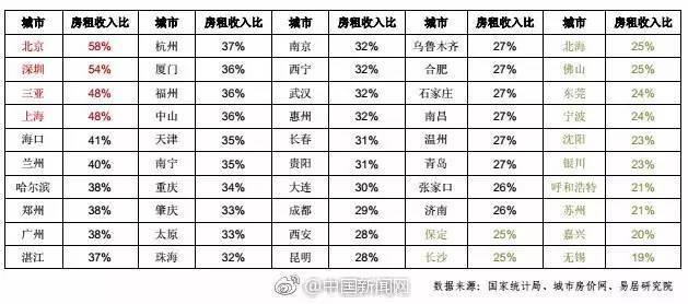 具体来看各城市的房租收入比,北京(58%)、深圳(54%)、三亚(48%)、上海(48%)等4个城市房租收入比高于45%,属于租金严重过高城市。