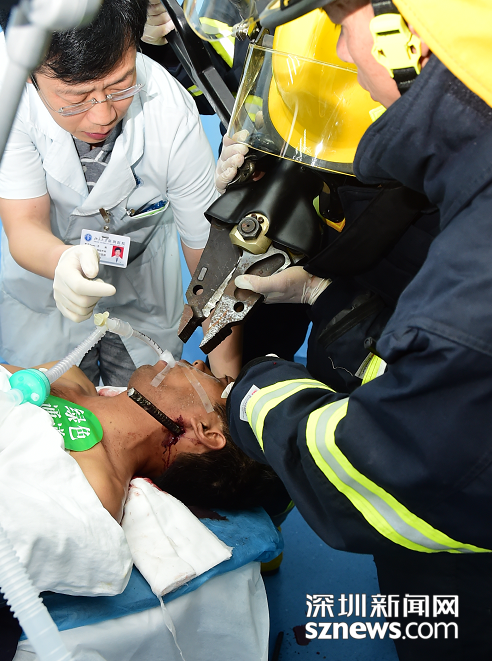 消防员和医疗人员消防员齐上阵,先行将伤者的颅外钢筋切除