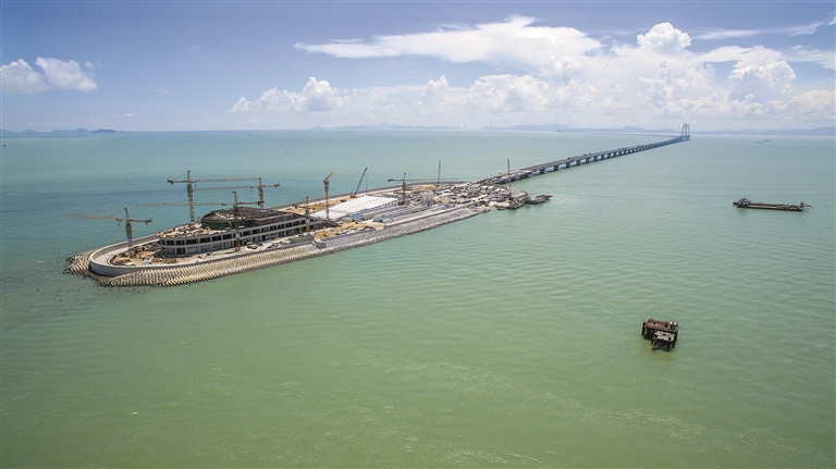 航拍下的港珠澳大桥西人工岛部分。港珠澳大桥青州航道桥,“中国结”镶嵌在两个索塔的上方,是港珠澳大桥最为醒目的标志。