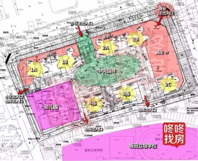从平面图中看到,虽有中央园林但规模不算大。商业主入口规划在华为荔枝苑对面,方便导入更多人流。2C、3、4栋北向看中央园林较为安静,南向为立培学校,无高层遮挡,视野景观相对较好。