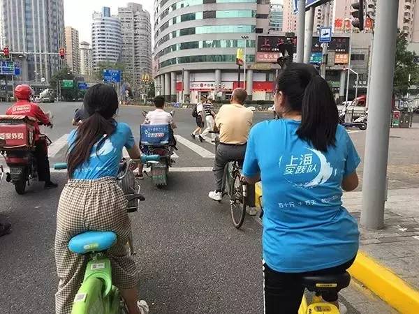 7月18日下午两点半,在桂林米粉店打杂完毕的两名队员赶往下一个工作地点。为了省交通费,队员们选择骑行免费的共享单车前往。澎湃新闻实习生 汪笑帆 摄