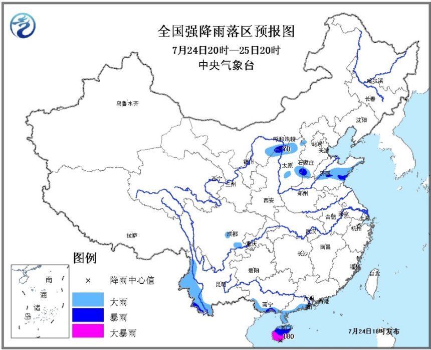 预计7月24日20时至25日20时,广东南部沿海、广西南部沿海、海南岛、内蒙古中部偏南地区、陕西北部、山西北部和东南部、河北西南部、山东中部、四川盆地西部、云南西部等地的部分地区有大雨或暴雨。