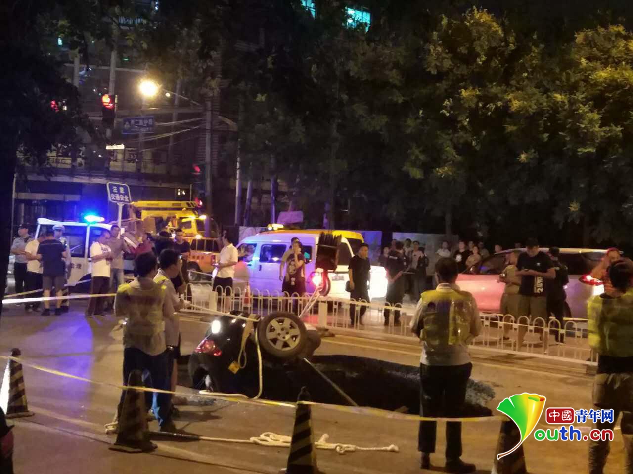 现场停有多辆警车和消防救援、市政工作车辆。中国青年网记者 王冠 摄
