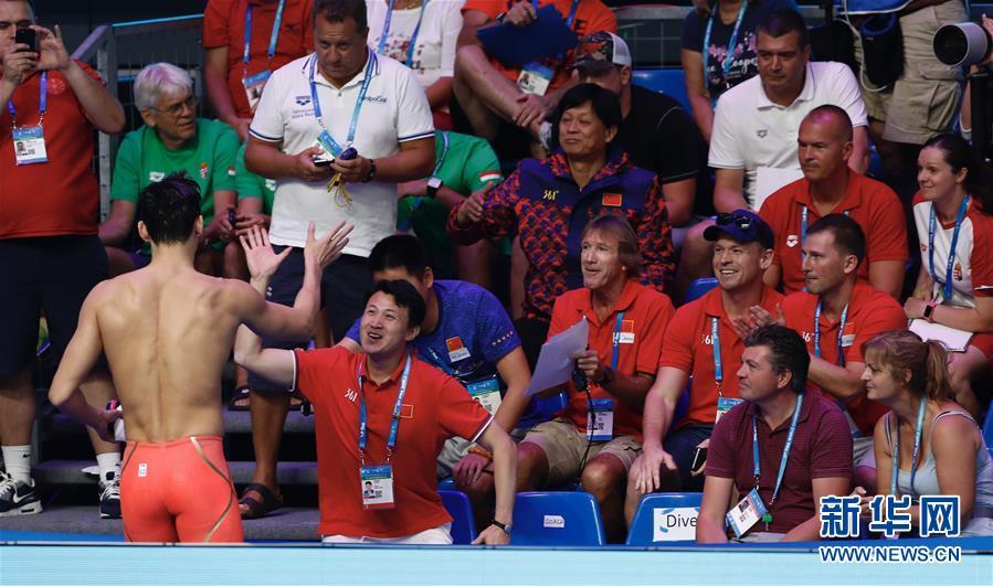 7月25日,孙杨(前左一)在决赛后接受祝贺。当日,在匈牙利布达佩斯进行的第17届国际泳联游泳世锦赛游泳男子200米自由泳决赛中,中国选手孙杨以1分44秒39的成绩夺冠。新华社记者丁旭 摄