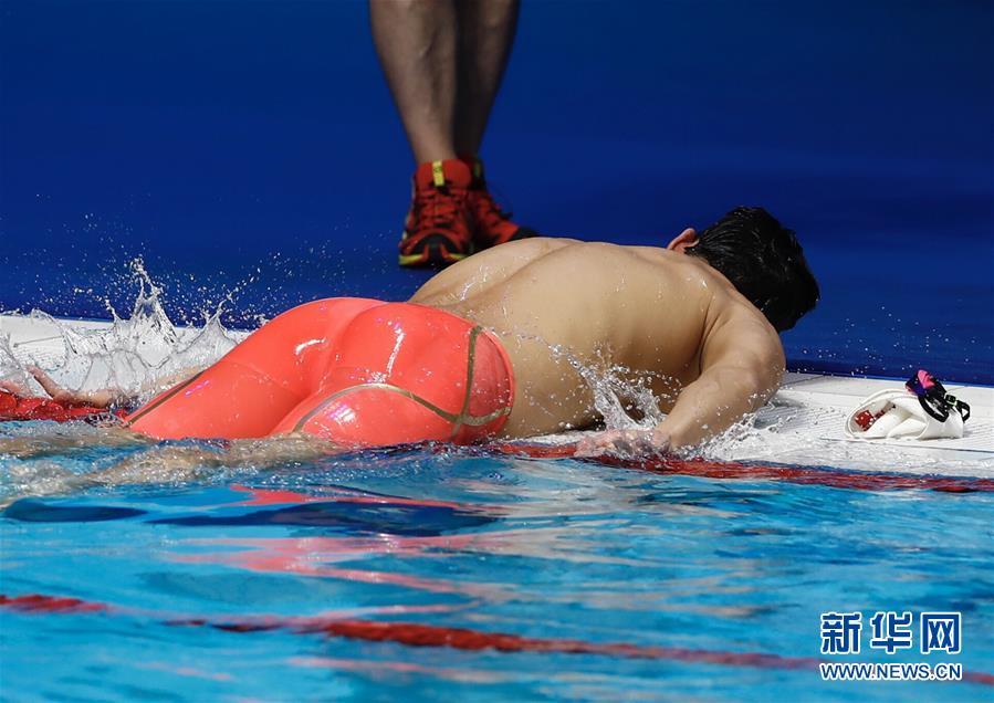 7月25日,孙杨在决赛后。当日,在匈牙利布达佩斯进行的第17届国际泳联游泳世锦赛游泳男子200米自由泳决赛中,中国选手孙杨以1分44秒39的成绩夺冠。新华社记者丁旭 摄