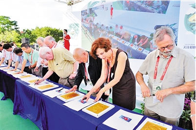 在主持人流利的英文开场后,大会组委会主席、中国植物学会理事长、中国科学院院士武维华,中国科学院院士洪德元、李家洋,美国科学院院士Peter H.Raven,奥地利科学院院士 Friedrich Ehrendorfer, 雷丁大学杰出教授Vernon Heywood等20位植物科学领域的专家代表参与启动,并在纪念簿上题词,打手模。