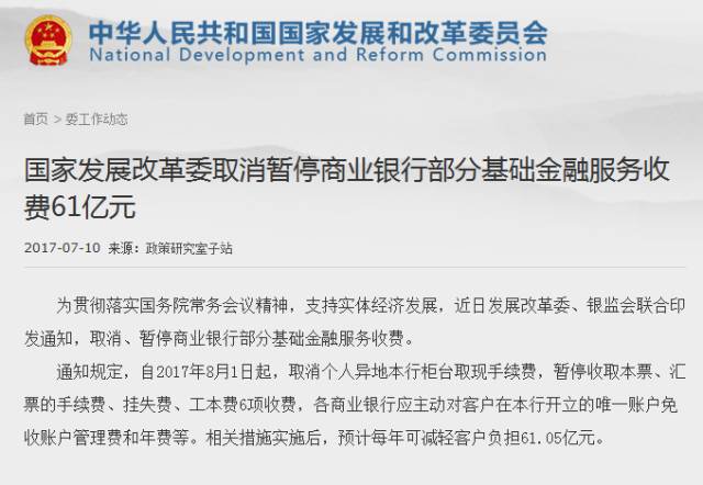 自2017年8月1日起,取消个人异地本行柜台取现手续费,暂停收取本票、汇票的手续费、挂失费、工本费6项收费,各商业银行应主动对客户在本行开立的唯一账户免收账户管理费和年费等。