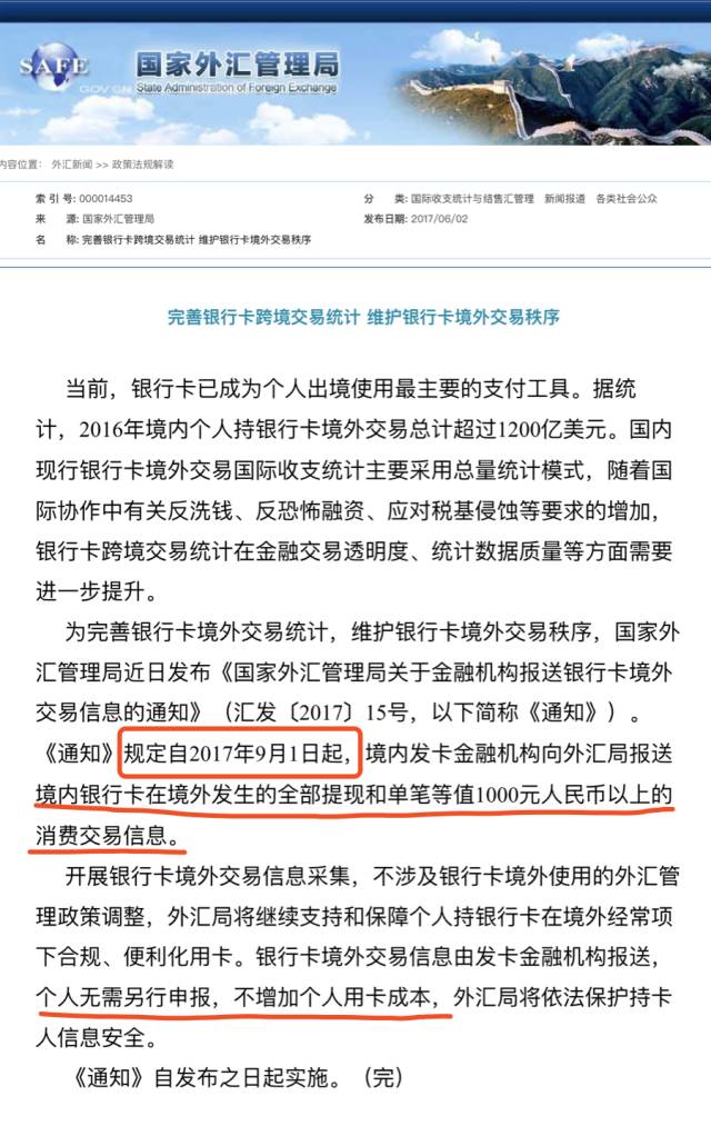 新闻提要 9月1号起,境外刷卡超1000元将被上报!!无论你在海外购物或者提取现金,只要单笔的金额等值人民币大于1000元,消费的相关信息将被自动采集!
