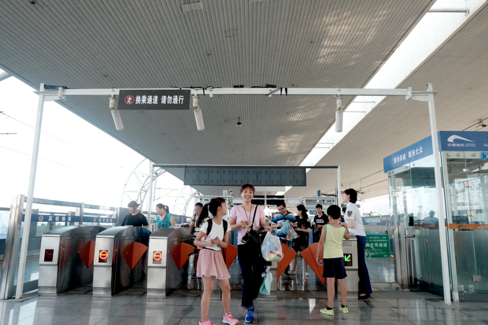 7月25日,成都,30多名市民从地铁2号线下车通过成灌快铁犀浦站的站台交互换乘通道。他们用时不到3分钟,完成了地铁换乘动车组的整个行程,快捷顺利地坐上了开往都江堰的C6111次动车。图文:人民日报