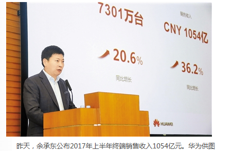 深圳新闻网讯 华为昨日发布2017年上半年经营业绩,公司销售收入达2831亿元人民币,同比增长15%。其中消费者业务的成绩相当亮眼,华为消费者业务CEO余承东昨日称,华为终端今年上半年销售收入突破千亿,达到1054亿元人民币,智能手机发货量7301万台。此外他还透露,今年秋天将推出人工智能芯片。