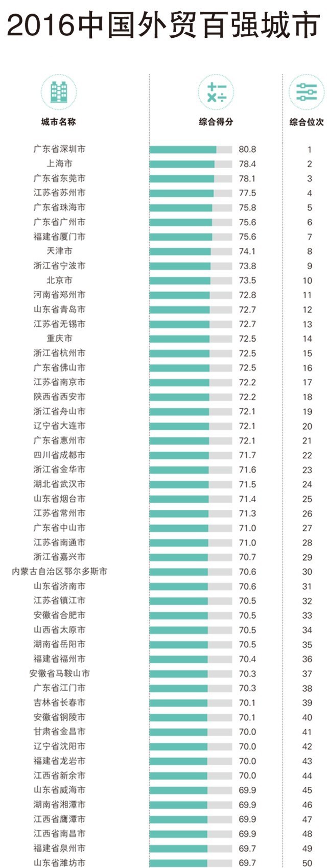 7月25日,海关总署发布了“2016中国外贸百强城市名单”,并由海关总署主管的《中国海关》杂志公布。