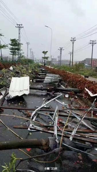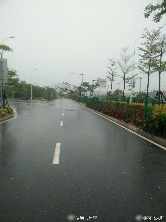 翔安南路集装箱被风吹翻,道路左右两侧部分路树倒伏,接到险情,公路部门第一时间到达现场抢通道路,目前主车道可正常通行。