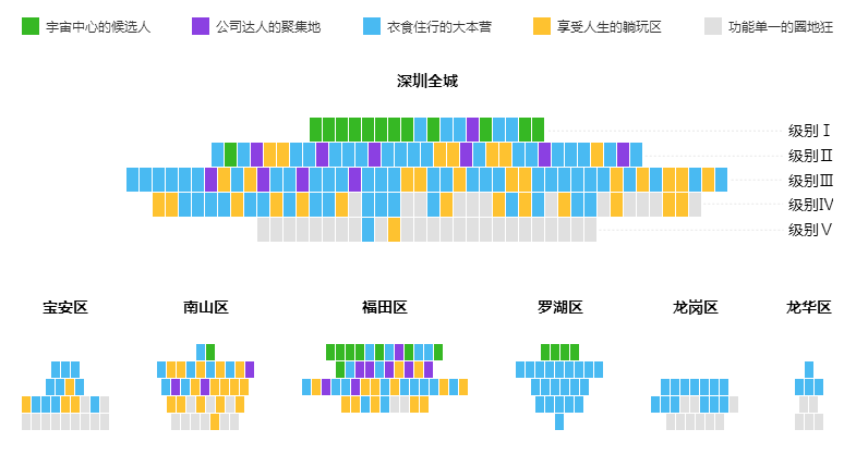 这些级别和标签,组成了深圳全城和各区的“势力图”,从图中我们可以看出,福田的“宇宙中心的候选人”地铁站数量最多,南山大多地铁站偏向“享受人生的躺玩区”,罗湖和龙岗则是以“衣食住行的大本营”为主。