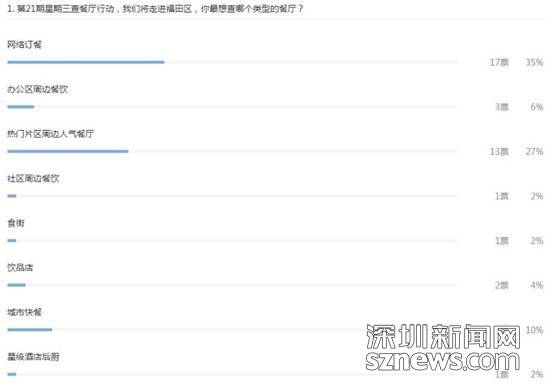 7月27日——7月30日深圳新闻网网页端和微信端开展了针对本次行动的民意调查共4267位市民参与其中。本次行动将检查的是福田区的餐饮场所,最多市民提议检查的是网络订餐,网页端投票1009人,占比23.91%,微信端有17票,占比35%。第二位是办公室周边餐饮餐馆,网页端投票917人,占比21.74%,微信端3有票,占比6%。排名第三位的是饮品店,网页端投票848人,占比20.11%,微信端有2票,占比4%。