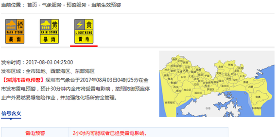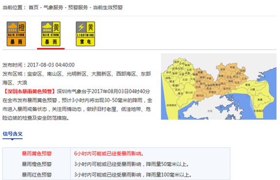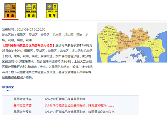 深圳市气象台于2017年08月03日06时50分在福田区,罗湖区,盐田区,龙岗区,坪山区和龙华区(民治、龙华、观湖、福城、观澜街道)发布暴雨橙色预警,部分地区已出现40-60毫米降水,预计强降雨还将持续2小时。