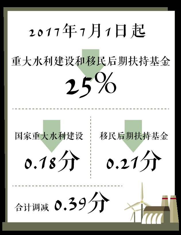 从2017年7月1日起,将国家重大水利工程建设基金和大中型水库移民后期扶持基金的征收标准统一 降低25%,我省的国家重大水利工程建设基金的征收标准每千瓦时降低0.18分,大中型水库移民后期扶持基金的征收标准 每千瓦时降低0.21分,合计调减0.39分。