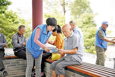 文明蓝马甲 区文促会民治分会会员付先容在民治德逸公园向市民派发文明宣传单。