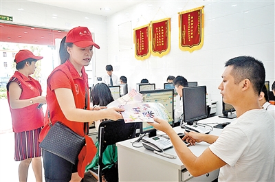 万能红马甲 观湖志愿者走进辖区商铺派发创文宣传资料。(资料图片)