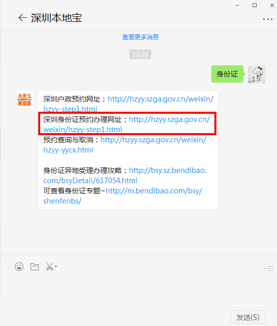 1.长按扫描文末二维码,或搜索关注“深圳本地宝”微信公众号,发送关键字“身份证”至后台,点击链接。