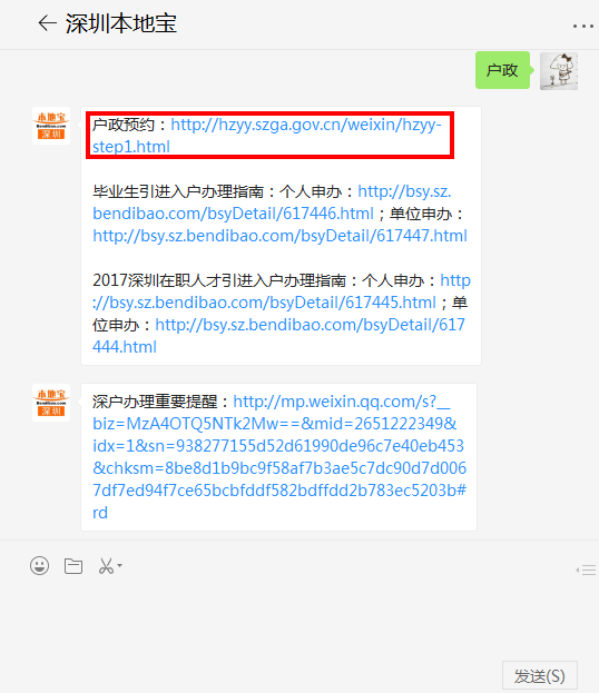 1.长按扫描文章底部二维码或搜索关注深圳本地宝(ID:bdbshenzhen)微信公众号,发送“户政”,点击户政预约链接。