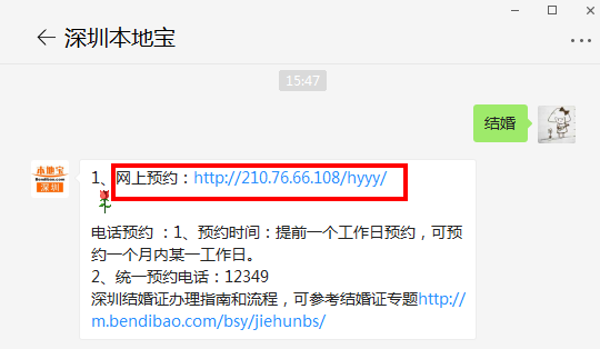1.发送关键字“结婚”至“深圳本地宝”微信公众号后台,点击链接进行预约。