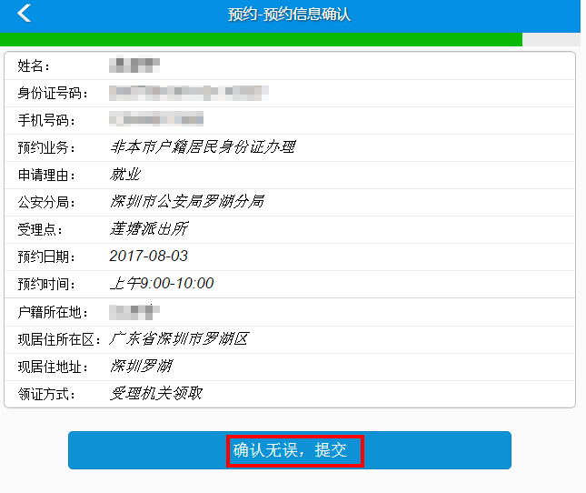 8.确认自己的信息正确无误后,提交后就可以在预约时间到预约地点办理啦!