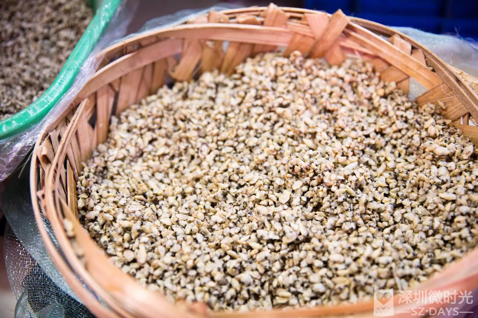 海瓜子是一种小的蛤蜊,潮汕话叫薄壳,瓜子一样大小,这筐子里装的是用机器剥好了的肉。拿葱蒜,加点金不换,在锅里稍微炒一下,美味难挡。