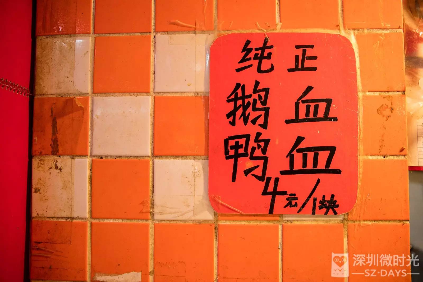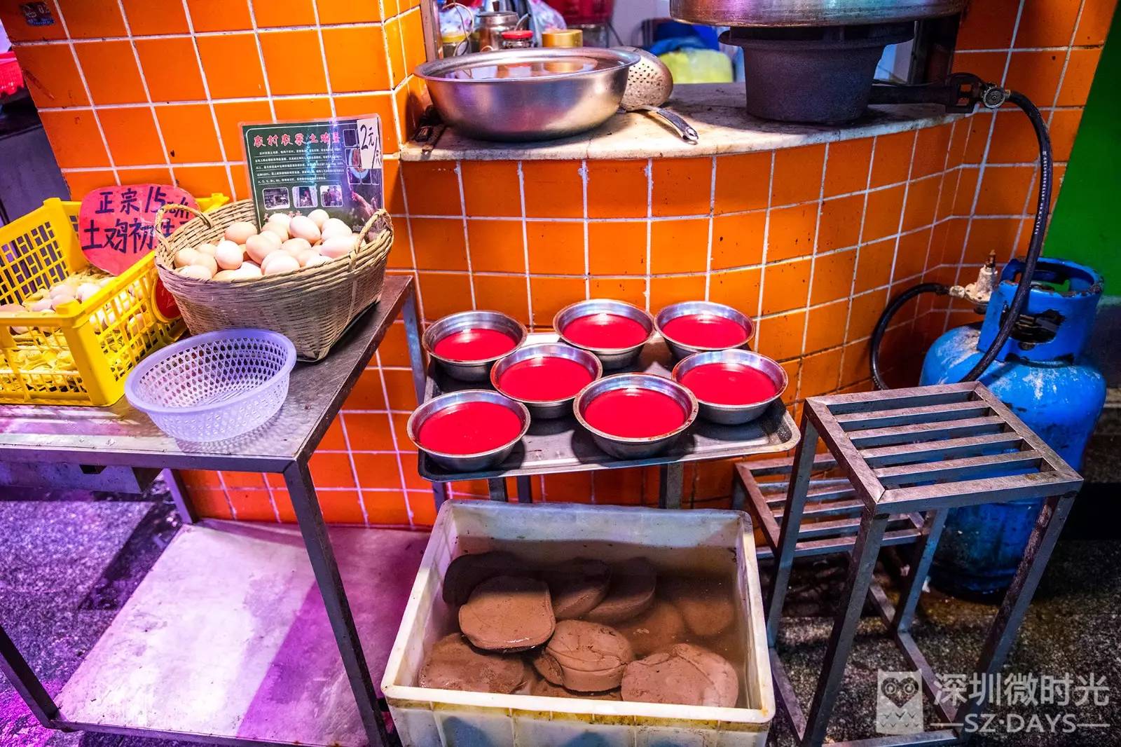 门面旁边摆着的是宰割家禽后剩下的鹅血、鸭血,还有土鸡蛋价格很便宜。