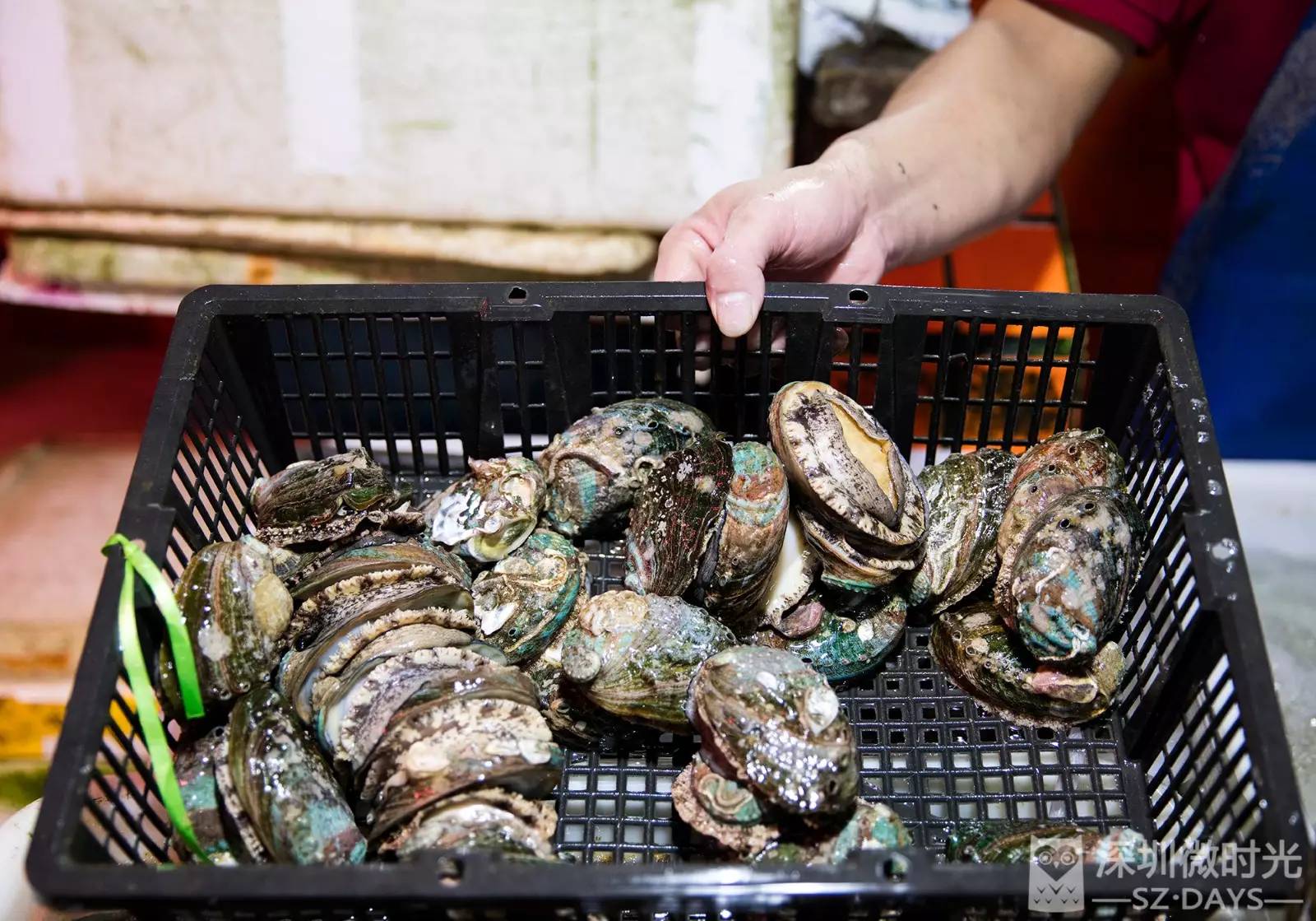 一筐筐的新鲜鲍鱼很抢眼,最靓最大个的三十块一个,小个些的、次一点的八块到十五块不等。