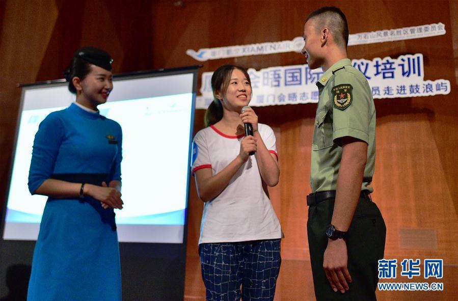 8月6日,厦航“白鹭之星”志愿者(中)与“鼓浪屿好八连”官兵一同学习基本的国际礼宾礼仪。当日,1000多名厦门志愿者分别在厦门大学明培体育馆和鼓浪屿现场集中学习国际礼宾礼仪。根据厦门会晤志愿服务总体方案的计划安排,从7月1日起至8月中旬,2000多名志愿者统一接受了专业培训。新华社记者魏培全摄