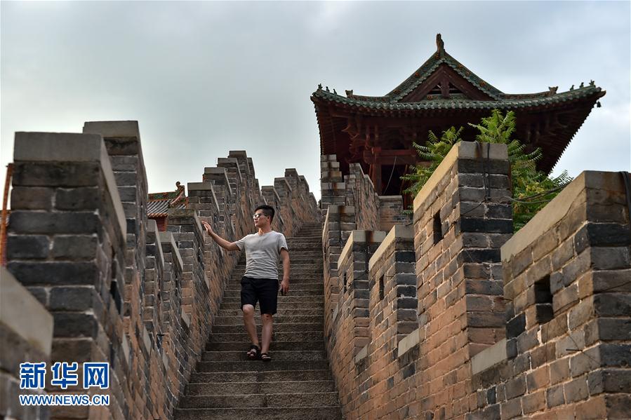 游客在山西省沁水县湘峪古堡的城墙上游玩(8月2日摄)。 3年前,近400岁的明代湘峪古堡人去堡空、房屋破败。如今,它以另一种形式“活”起来。湘峪古堡位于山西省沁水县,中空的古城墙、绿莹莹的护城河、中西合璧的民居、全国罕见的“双插花院”,让它显得格外神秘。新华社记者 曹阳摄