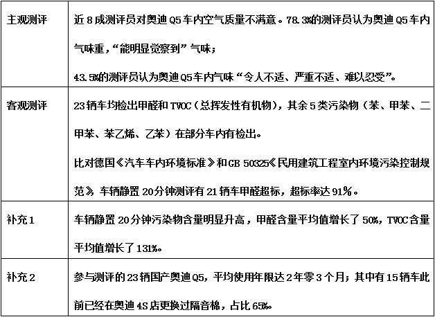 7月1日,深圳消委会委托第三方专业检测机构,对23辆符合申请测评条件的、出厂日期为2013年6月-2016年10月的国产奥迪Q5进行了车内空气质量主客观测评,结果显示: