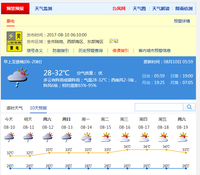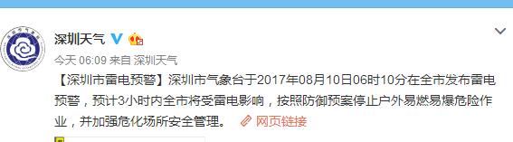 深圳市气象台于2017年08月10日06时10分在全市发布雷电预警,预计3小时内全市将受雷电影响,按照防御预案停止户外易燃易爆危险作业,并加强危化场所安全管理。